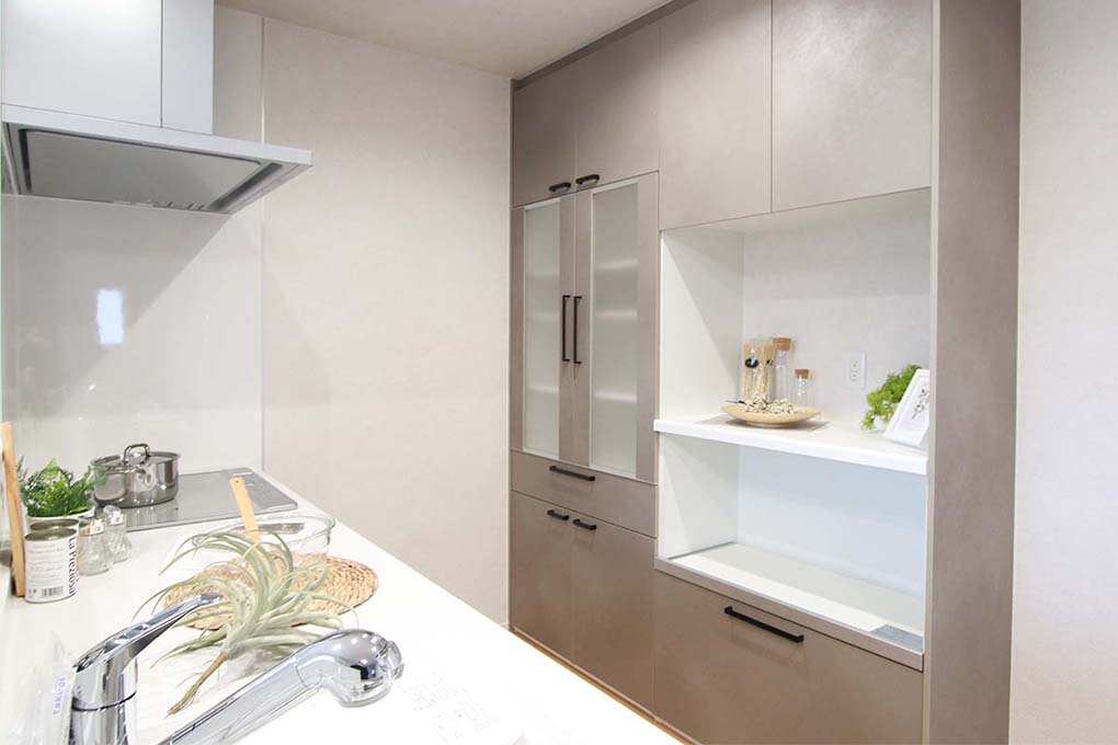 対面式システムキッチンには使いやすいスライド収納装備。